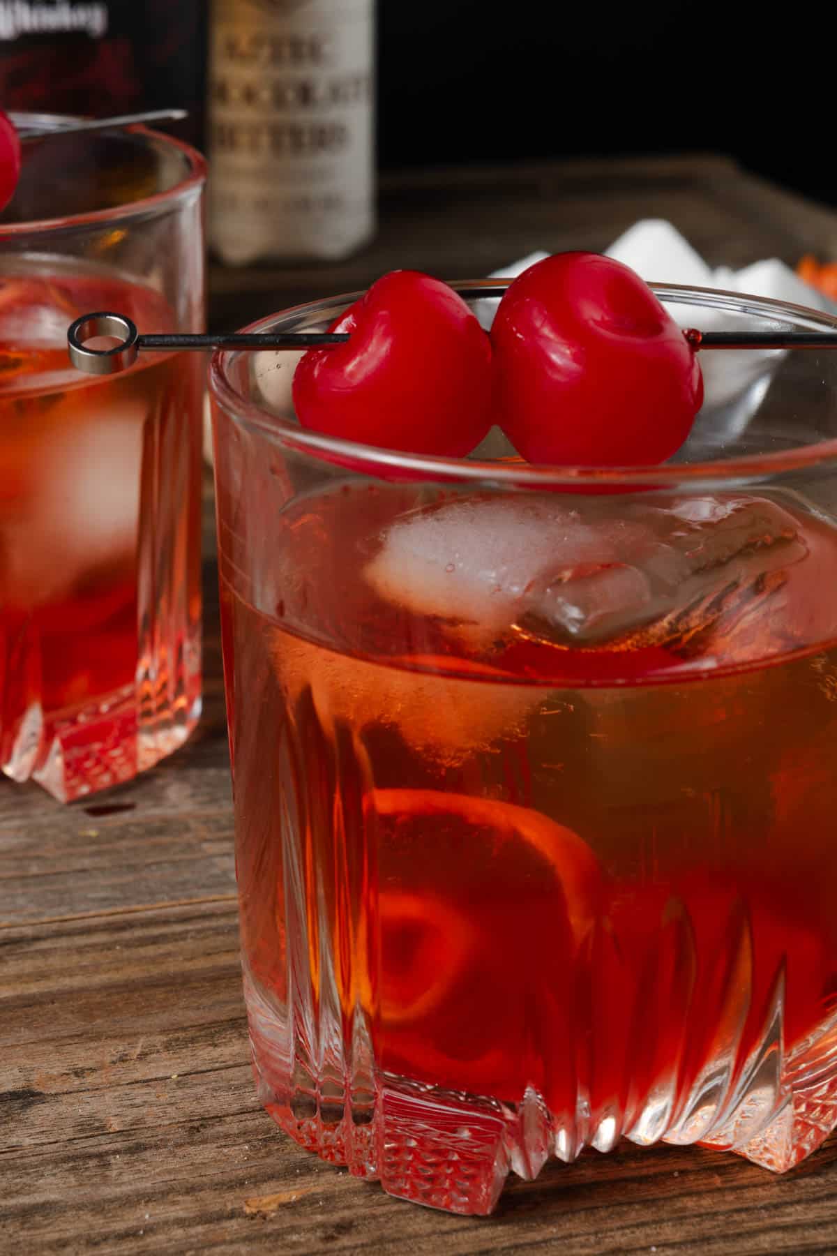 - Muddle the sugar cube, cherry, and chocolate bitters in the bottom of a rocks glass.